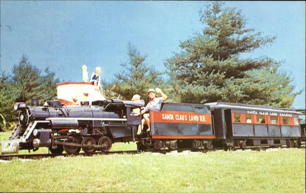 | A ride on the original Santa Claus Land Railway is a must on a visit to Santa Claus Land. This train takes its passengers through the Land of Mother Goose. An exact scale model of a B&O locomotive, tender and coaches carry adults and children alike on a half-mile tour featuring trackside nursery rhyme characters-Humpty Dumpty, Little Boy Blue, Jack and Jill, Mary and Her Little Lamb and other childhood favorites. |