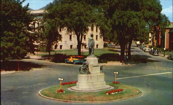 Soldiers' monument, Library and Common Lynn, Mass. PUB. BY: WAKEFIELD TRADING CO., P. O. BOX 13, WAKEFIELD, MASS. Lusterchrome MADE IN U.S. A. K-1766