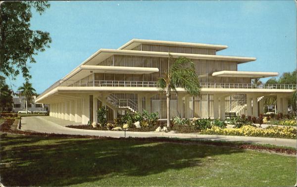 BK.8-M. E. RUSSELL, SARASOTA, FLORIDA MUNICIPAL AUDITORIUM, BRADENTON, FLORIDA BEAUTIFUL TROPICAL PLANTINGS SURROUND CURTEICHCOLOR 3-D NATURAL COLOR REPRODUCTIONS (REG. U. S. A. PAT. OFF.) 2DK-1100 HERE