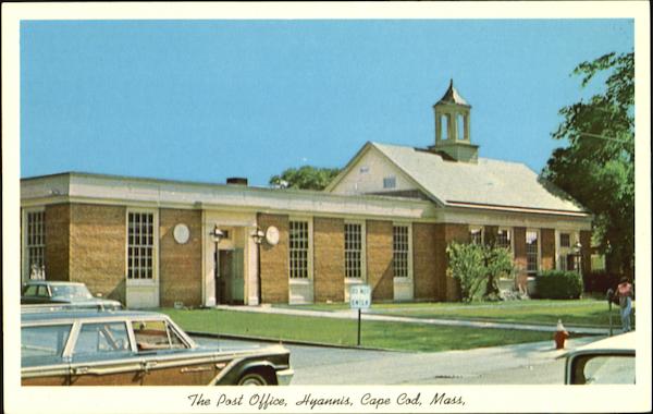 Front: The Post Office, Hyannis, Cape Cod, Mass, Back: DISTRIBUTED BY E. D. WEST CO., SOUTH YARMOUTH, CAPE COD, MASS. PHOTO BY HAYDN MASON CURTEICHCOLOR R 3-D NATURAL COLOR REPRODUCTION (REG. U. S. A. PAT. OFF.) 4DK-1458
