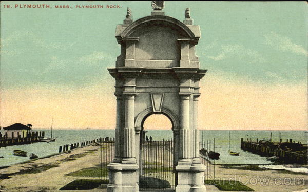 Front: 18. PLYMOUTH, MASS., PLYMOUTH ROCK. Back: MASON BROS. & Co., BOSTON, MASS. THIS SPACE MAY BE USED FOR COMMUNICATION AND CANADA, FOREIGN, TWO CENTS.