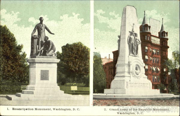 Front: 1. Emancipation Monument, Washington, D. C. CRAND ARMY OF THE RESU 2. Grand Army of the Republic Monument, Washington, D. C. Back: 100 #43 TWO CENTS