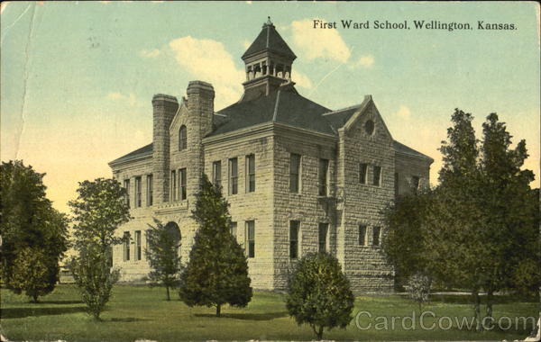 Front: 11 First Ward School, Wellington, Kansas. Back: Just a line to let know I havn't forgot you and are having good know when we will ben home your Minnie. 12 7912 RD miss Eve Funk R-22491 Center clay Kaus