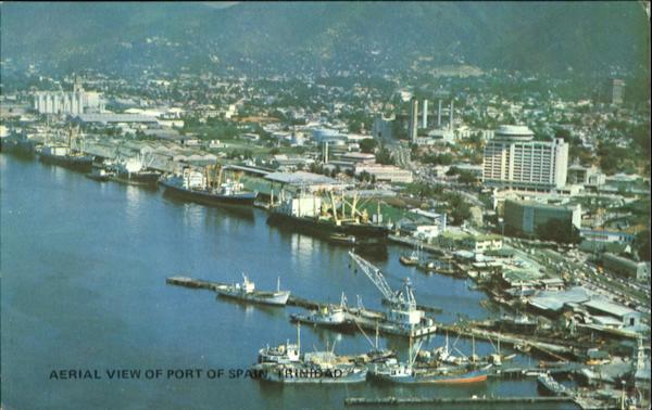 This aerial view of Trinidad's capital shows the waterfront and Port of Spain west and the Northern Range of mountains in the rear