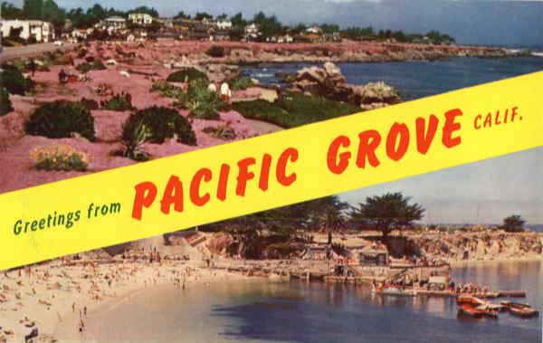 Front: PACIFIC GROVE Greetings from CALIF. Back: COLOR Top View--The MAGIC CARPET of Ice-plants. Lower View - Pacific Grove Beach and Glass Bottom Boats. 27 Mike Koberta BERKELEY 2, CALIF. Distributed by Bell Magazine Agency, Monterey, Calif.- C7832