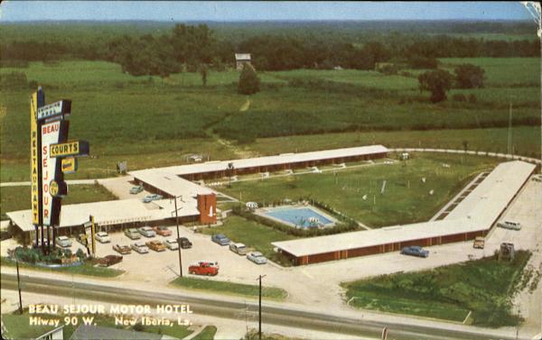 Series 96183 Located in the land of Evangeline U. S. 90 W., New Iberia, Louisiana Em 4-4501 46 Carpeted units for luxury living. Every room with: tile bath; tub and shower; instant hot water; finest air conditioning and heating, individually controlled; telephones and free TV; room and laundry service. Private entrances from every room to our 2 acre playland, complete with swings, slides, etc. Extra spacious adult pool with kiddie pool adjoining, lights for night swimming. |