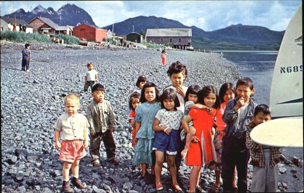 "RED CARPET COMMITTEE" This cheerful little group meets every plane and boat at Old Harbor, Kodiak Island. No one fishes in the winterl Photographed by Alf Madsen OUTDOOR FILMS - Kodiak, Alaska S-56139-1 HERE