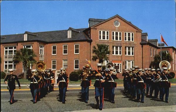 The colorful Marine Corps Band Performs the traditional march to morning colors