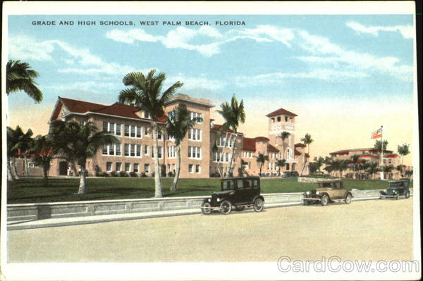 Series 12421-124 The Central borough schools of the City of West Palm Beach. Florida. These three handsome buildings house primary, grammar and high school classes, respectively, and are set in beautiful tropical surroundings. To the rear is an excellent athletic field. |