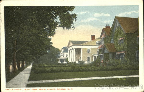 Front: CASTLE STREET, WEST FROM BROOK STREET, GENEVA, N. Y. 222041 Back: Blue Lake The Adirondacks, Here we are #43-NY" JUN 1937 5 AGE for the second Dr n.C. Bates. in.c. Bellevue, weight. Coff Obio.