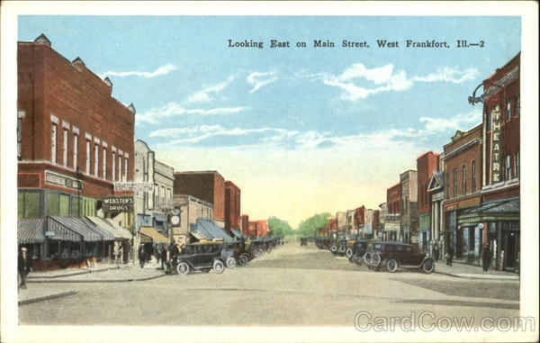 Front: ROSEMICK WEBSTER'S DRUGS Looking East on Main Street, West Frankfort, Ill.-2 BRUG YAS HEATRE Back: E. C. KROPP CO., MILWAUKEE 899 N HERE
