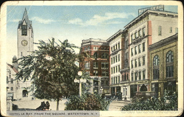 Front: SLATER'S STUDIO HOTEL LE RAY, FROM THE SQUARE, WATERTOWN, N. Y. SCHOOL MOTE LE RAV WONDERLAND DRUGS Back: Two cents