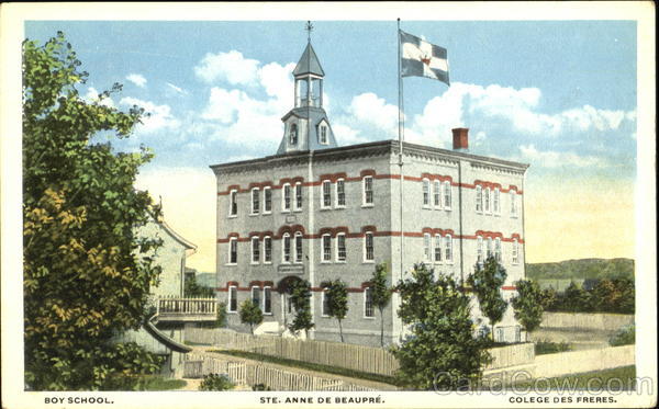 Front: 000 BOY SCHOOL. STE. ANNE DE BEAUPRE. COLEGE DES FRERES. Back: PUBLISHED BY J. A. E. MOREL, ROYAL MUSEUM-MUSEE ROYAL. STE. ANNE DE BEAUPRE CAN, P.Q. R-77582 Cal C. T. THIS SPACE FOR ADDRESS ONLY.