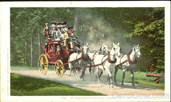 Front: COPYRIGHT, 1903, BY DETROIT PHOTOGRAPHIC CO. 7654. AN ADIRONDACK MOUNTAIN STAGE. Back: AND CANADA, FOREIGN, Two CENTS. THIS SIDE FOR THE ADDRESS