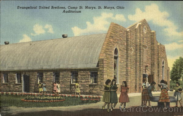 Front: Evangelical United Brethren, Camp St. Marys, St. Marys, Ohio Auditorium Back: DISTRIBUTED BY EN DICOTT PHOTOGRAPHERS, ST. MARYS, OHIO ایا