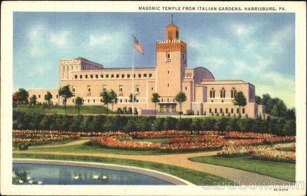 Front: MASONIC TEMPLE FROM ITALIAN GARDENS, HARRISBURG, PA. 3A-H919 Back: "C. T. ART-COLORTONE,” MADE ONLY BY CURT TEICH & Co., INC., CHICAGO, U.S.A. J. B. HOFFMAN, HARRISBURG, PA.