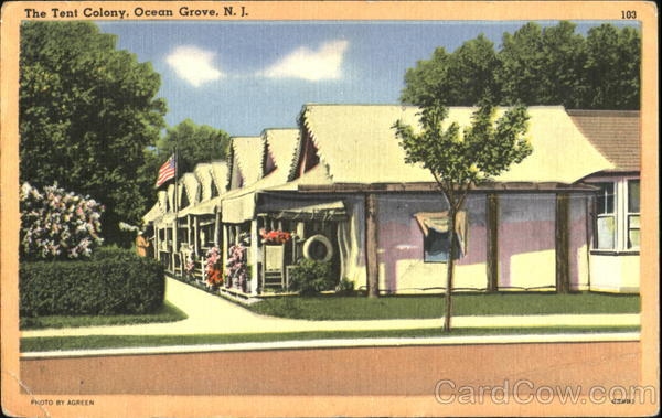 Front: The Tent Colony, Ocean Grove, N. J. 103 PROTO BY AGREEN 63991 Back: "TICHNOR QUALITY VIEWS" REG. U. S. PAT. OFF. MADE ONLY BY TICHNOR BROS., INC., BOSTON, MASS. STAR STATIONERY CO., NEWARK, N. J.
