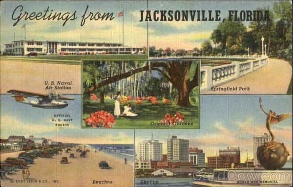 Series 2B-H634 Jacksonville invites you to come and enjoy one of America's greatest summer and winter resorts . . . cool in summer, balmy in winter. The world's finest motoring and bathing beach, 600 feet wide at low tide, Florida's best golf, excellent fresh and salt-water fishing, hunting, gay night life and military color await you in this famous playground and Army and Navy center. Come to Jacksonville for the time of your life. |