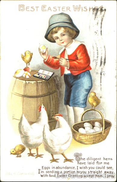 The diligent hens have laid for me Eggs in abundance, I wish you could see; I'm sending a portion to you straight away. With fond Easter Greeting accept them, I pray. |