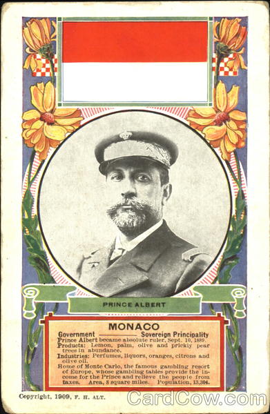 Monaco Government Sovereign Principality Prince Albert became absolute ruler. Sept. 10, 1889. Products: Lemon, palm, olive and prickley pear trees in abundance. Industries: Perfumes, liquors, oranges, citrons and olive oil. Home of Monte Cairo, the famous gambling resort or Europe, whose gambling tables provide the income for the Prince and relieve the people form taxes. Area, 8 square miles. Population 13,304." |