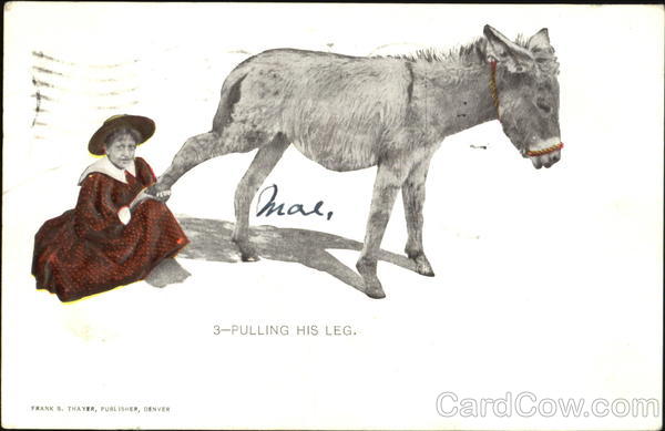 Front: FRANK S. THAYER, PUBLISHER, DENVER mal, 3-PULLING HIS LEG. Back: UNITED STATES OF POSTAR ARTGALLES 19 BO PMPM THE ADRES 06 1706 FRANKLIN 1790 AGE Mass Effie Wilder 406 S. 1.St. North Jakina Wash