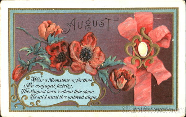 August Wear a Moonstone or for thee No conjugal felicity; The August born without this stone. Tis said must live unloved alone COPYRIGHT 1907, BY A.Q. SOUTHWICK NY