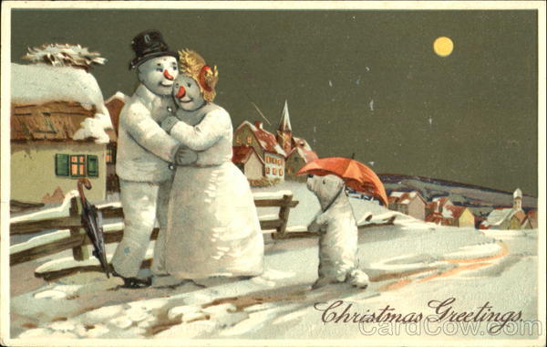 A Christmas Snowman Couple and Snowdog Out for a Stroll