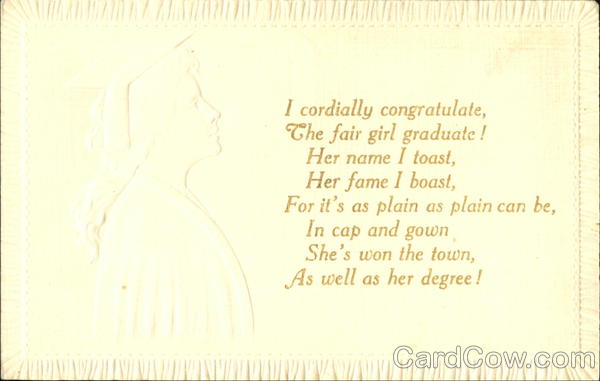 I cordially congratulate, The fair girl graduate! Her name I toast, Her fame I boast, For it's as plain as plain cab be, In cap and gown, She's won the town, As well as her degree!"