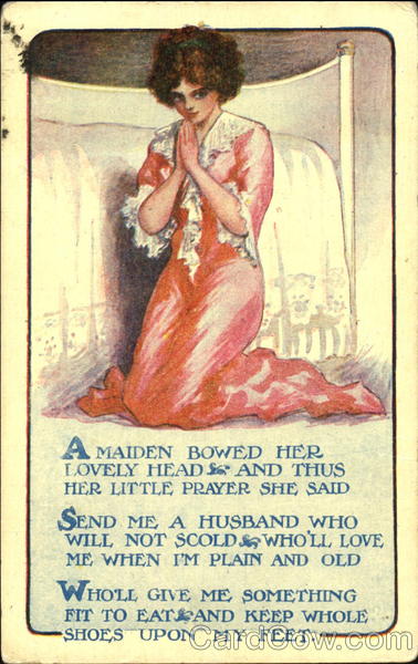 A maiden bowed her Lovely head and thus her little prayer she said Send me a Husband who will not scold Who'll Love me when I'm plain and old Wholl give me something fit to eat and keep whole shoes upon my feet.