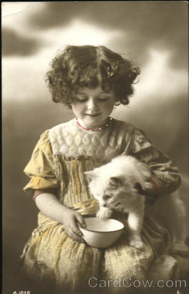 Young Girl with White Cat and Bowl
