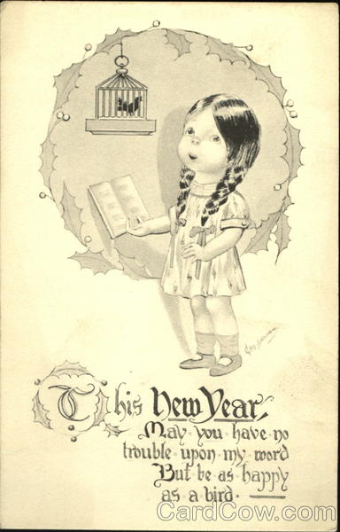 Front: This Yew Year May you have yo trouble upon my word But be as happy as a bird. Back: UNITED ART PUBLISHING CO., NEW YORK CITY (PRINTED IN GERMANY.J HN 306 12 F 61 Made in Germany