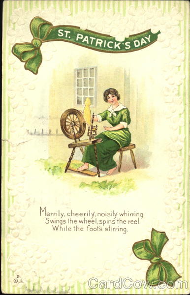 Merrily, Cheerily, noisily whirring Swings the wheel spins the reel While the foot's stirring