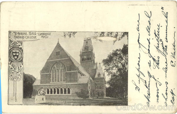 Front: CHROT HARVARD COLLEGE MASS: MEMORIAL HALL-CAMBRIDGE ar Suppose you deal skatie now of. This picture shows where lot. "aminals" Back: BOG FRANKLIN TRDO GNE CEN BOSTON DEC GE 19. MASS 06 51 WIN My Louis Sortzel, Windsor P.O Connectient. WNC