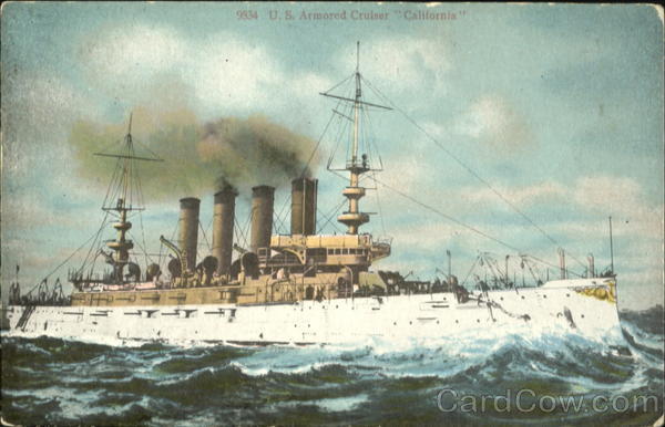 Series 9534 U. S. Armored Cruiser "California" Built at San Francisco by union Iron Wks. 502 feet long by 69 feet 6 1/2 inches wide. Mean draft 24 feet 1 inch. Displacement 13,680 tons. Speed 22 knots; horsepower 22,000. Launched April 28, 1904. Complement of 41 iffucers abd 791 men. Two military masts and four funnels. Main Battery - Four 8-in B. L. R. in turrets, and fourteen 6-in R. f. Broadside. Secondary Battery - Eighteen 3-in R. f., Twelve 3-lb s. A. tow 1-lb R. F. two 3-in F Four 30 caliber A. Two 30 caliber M |
