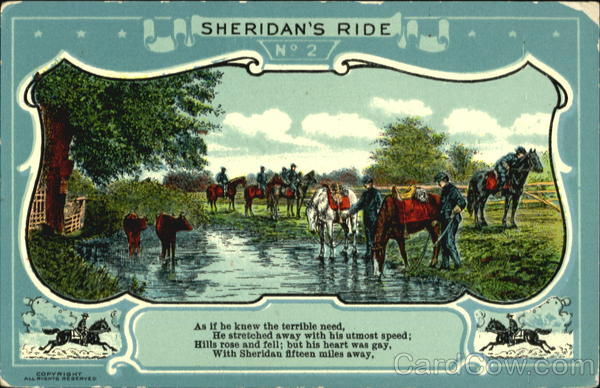 Front: COPYRIGHT ALL RIGHTS RESERVED SHERIDAN'S RIDE N° 2 As if he knew the terrible need, He stretched away with his utmost speed; Hills rose and fell; but his heart was gay, With Sheridan fifteen miles away, Back: 200 Post Grd FOR ADDRESS ONLY