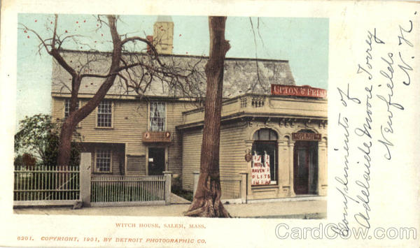 Front: WITCH HOUSE, SALEM, MASS. 6201. COPYRIGHT, 1901, BY DETROIT PHOTOGRAPHIC CO. RED RAVEN PLITS UPTON & FRIS Complements of Adelaide Moore Torrey Newfields N.H Back: MAGIC STORE AND CANADA, FOREIGN. Two CENTS. Miss AM Champion Westbrook bonn