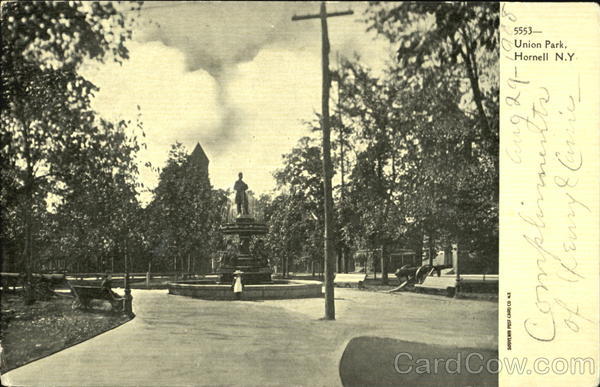 Front: 5553- Union Park, Hornell N.Y. SOUVENIR POST CARD CO NY Aug 29- Compliments of Kerry & Camic Back: 250 #43 The ES Cromer Jorona