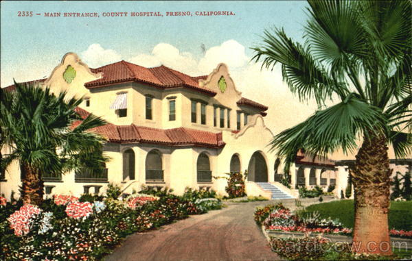 Front: 2335 MAIN ENTRANCE, COUNTY HOSPITAL, FRESNO, CALIFORNIA. (i) Back: FOREIGY MADE IN AMERICA BY EDW.H.MITCHELL AT SAN FRANCISCO, CALIFORNIA. 1-2 1,00