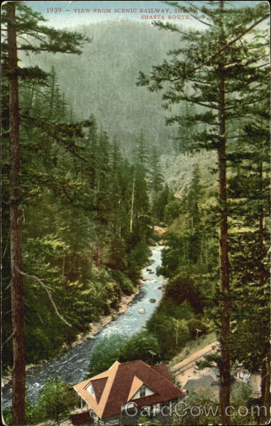 Front: 1939 VIEW FROM SCENIC RAILWAY, SHASTA SHASTA ROUTE, Back: MADE IN AMERICA BY EDW H MITCHELL AT SAN FRANCISCO. FOREIG ADDRESS ONLY
