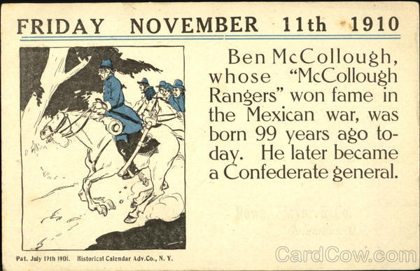Today is the 155th anniversary of the frightful earthquake at Lisbon, Portugal, in which 50,000 lives were lost within eight minutes. Christopher Columbus in Fetters, Cadiz, Spain 1910 After discovering he continent of America, Christopher Columbus returned in fetters to Cadiz, Spain, 410 years ago today Ben McCollough, Mexican War, Confederate General, 1910 Ben McCollough, whose "McCollough Rangers" won fame in the Mexican War, was born 99 years ago today. He later became aConfederate general Nov 20 1910 English took Philadelphia 1777 Historical The English took possession of Philadelphia exactly 133 years ago today, evacuating it the following March 17th. British Evacuate New York, Americans Take Possession Illustration depicting a patriotic figure in a stars-and-stripes suit pointing a man in a dark coat out a door, commemorating the British evacuation of New York 127 years prior to November 25th, 1910. Tuesday Nov 29 1910, Sons of Liberty Reorganized In New York 137 years ago today the Sons of Liberty were reorganized to fight against England for American Independence. |