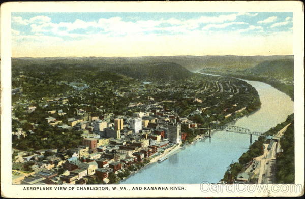 Front: AEROPLANE VIEW OF CHARLESTON, W. VA., AND KANAWHA RIVER. Back: A-85514 MADE IN USA AND ISLAND POSSESSIONS, CUBA, CANADA AND MEXICO VA (10 PUBLISHED BY THE S. SPENCER MOORE CO., CHARLESTON, W