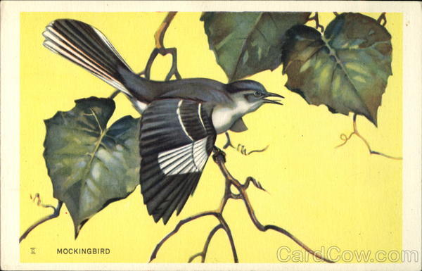 Wildlife Postcard Series Series Mockingbird (Mimus Polyglottos) Immortalized in music and literature,the lilting song of the Mockingbird has long been one of the rare delights of nature. The charm and variety of his song is surpassed by few other birds. True to his name,he delights in mimicking olthr birds and has even been known to mimic musical instruments. The world is his,and he makes himself at home equally in the small backyard or the open meadowland. One lone Mockingbird can lift his voice in song in the the soft summer moonlight,and soon,from every corner of the meadow,other birds will wake to join him. The nest is small and loosely made of twigs,usually located in shrubs or low trees |