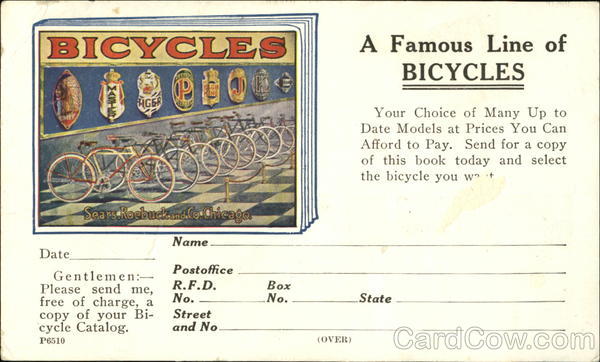Series P6510 Your Choice of many Up to Date Models at Prices You can Afford to Pay. Send for a copy of this book today and select the bicycle you want. Ride a bicycle this year and get all the fun and fresh air you should have Thousands are riding bicycles to save time and car fare going to and from work. Etc. Thousands more are using bicycles profitably in collecting,canvassing and the like. More people than ever will buy bicycles this year,Our prices on high grade bicycles will save you $10.00 or more over prices asked elsewhere,depending on the model you select. Fill out the catalog application on the other side of this card and prove it to your own satisfaction |
