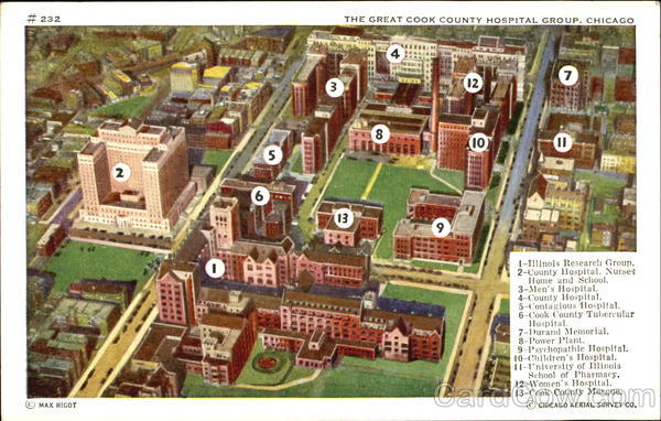 Series 232 1-Illinois Research Group. 2-County Hospital. Nurses Home and School. 3-Men's Hospital. 4-County Hospital. 5-Contagious Hospital. 6-Cook County Tubercular Hospital. 7-Durand Memorial. 8-Power Plant. 9-Psychopathic Hospital. 11-University of Illinois School of Pharmacy. 12-Women's Hospital. 13-Cook County Morgue. The World's greatest medical center, situated in the heart of Chicago's west side, bounded by Harrison, Wood, Polk and Lincoln Streets. Internationally known for its high medical standards |