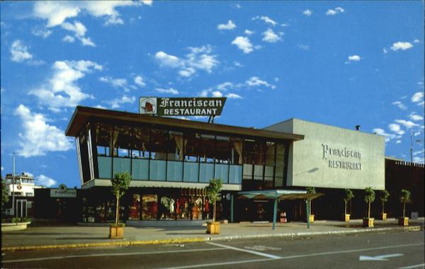 Series SC11363 The Franciscan Restaurant Fisherman's Wharf, San Francisco, Calif. is designed in a three-tiered arrangement, providing all patrons with an unobstructed view of a most beautiful expanse of the Bay, Alcatraz Island and the City. In this unusual atmosphere discerning diners partake of the finest food and drink available anywhere |