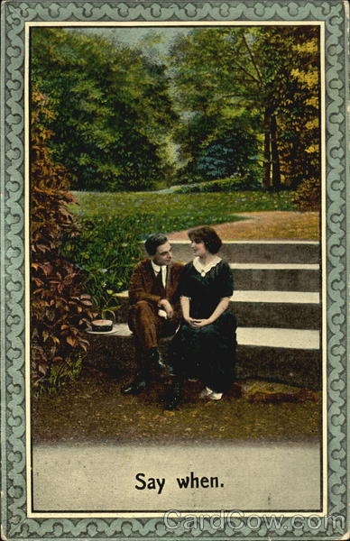 Front: Say when. Back: BAMFORTH & CO. PUBLISHERS HOLMFIRTH AND NEW YORK. NO. 6015 (ENGLAND) COPYRIGHT 1910 BY BAMFORTH & CO. POST 4 AUGYS 14-ADP Its up to you. Mr. Louis Stoltze Hally 213 Zion St. Hartford. barn.