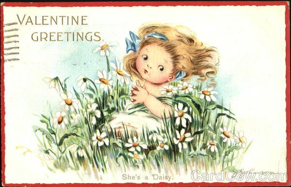Front: VALENTINE GREETINGS. J Johnson She's a Daisy. Back: "Valentine" Series -Postcard No. 407. POST ARD FEBI3 to For Correspondence. 2-AM 1915 NT OSTAGE Miss EUNICE LANgs, 2056 YORK St., City. 2-