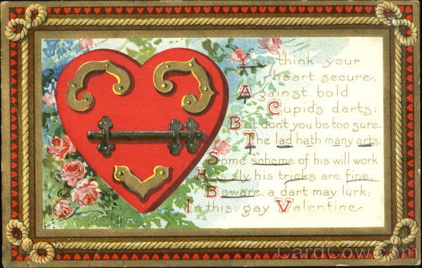 Front: think your heart secure, Against bold Cupid's darts: Bat don't you be too sure. The lad hath many arts. Some scheme of his will work sly his tricks are fine, Beware, a dart may lurk; this gay Valentine Back: Grain Holmes Nash;