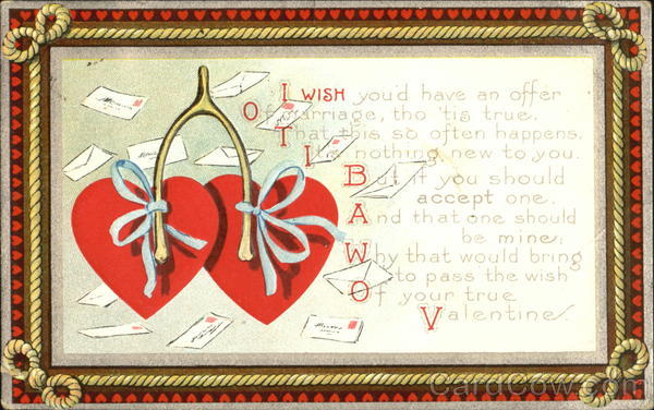 I wish you'd have an offer Of marriage, tho 'tis true That this so often happens It's nothing new to you. But if you should accept one, And that one should be mine: Why that would bring to pass the wish Of your true Valentine