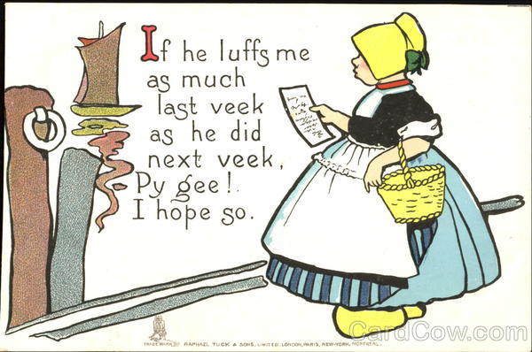 Front: If he luffs me as much last veek as he did next veek, Py gee! I hope so. TRADE MARK RAPHAEL TUCK & SONS, LIMITED. LONDON, PARIS, NEW-YORK, MONTREAL. Back: 100 ARTISTIC SAITS TRADE MA